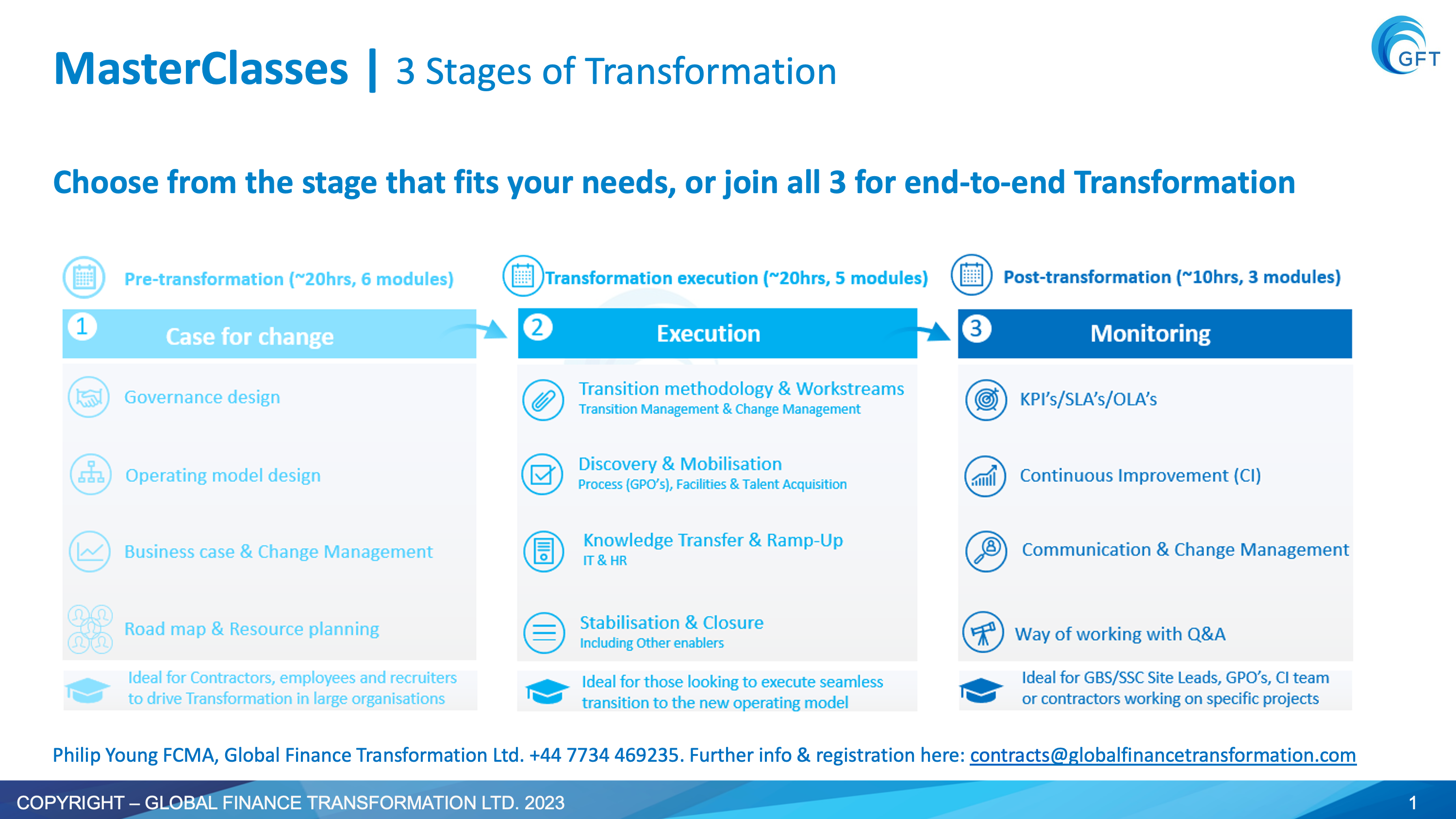 Any combination of the 3 courses will develop and further motivate your teams to manage the change and learn to work with best practice transition methodology, significantly reducing the spend with external partners and gaining trust on program delivery with their peers